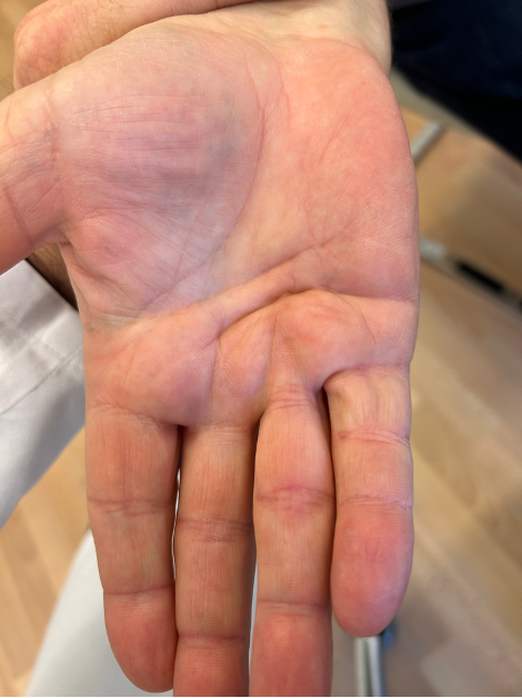 The symptoms of Dupuytren’s contracture usually begin harmlessly and gradually. In most cases, the little finger and the ring finger are affected, in rare cases other fingers. In 80% of cases, the symptoms occur on both sides of the hand.